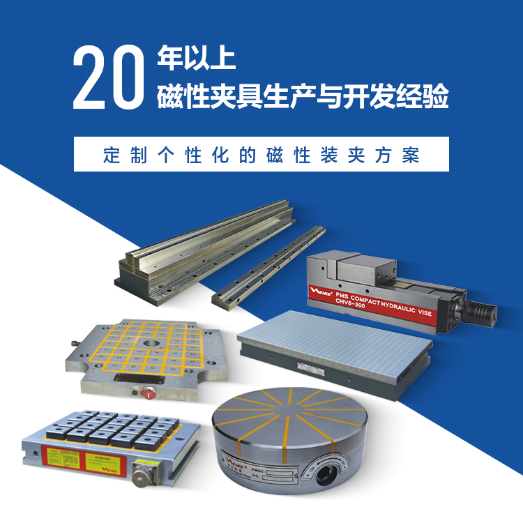 紹興市威克精密機(jī)械有限公司是一家專(zhuān)業(yè)從事磁性?shī)A具生產(chǎn)與開(kāi)發(fā)的企業(yè),擁有20年以上的行業(yè)經(jīng)驗(yàn)。威克產(chǎn)品系列包括電磁吸盤(pán)、電控永磁吸盤(pán)、永磁吸盤(pán)、電永磁快速換模系統(tǒng)、真空吸盤(pán)、磁力吊重器、充退磁控制器、精密虎鉗、手轉(zhuǎn)工具萬(wàn)力、磨床法蘭、沖子成型器、銑刀研磨機(jī)、自動(dòng)攻絲機(jī)、倒角機(jī)、磁性座、機(jī)床附件等。我們的產(chǎn)品廣泛應(yīng)用于銑床,平面磨床和CNC......